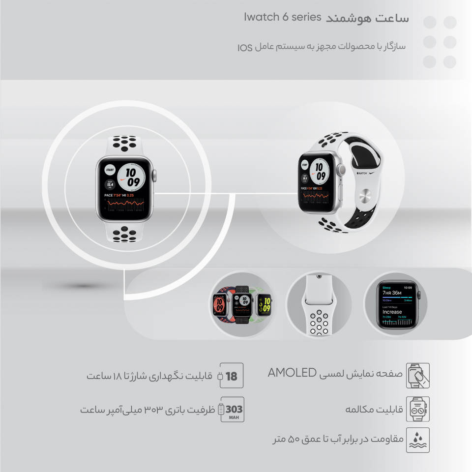 اپل واچ سری 6 مدل 44mm Space Gray Aluminum Case with Nike Sport Band از ساعتهای هوشمند زیبای برند اپل است.این اپلواچ 44 میلیمتری ویژگیهای خاصی دارد که میتوان از میان آنها به مقاومت در برابر آب تا عمق 50 متری اشاره کرد. مقاومت در برابر آب این مدل موجب میشود، کاربر هنگام بارش باران یا شستوشوی دست، بدون نگرانی از این گجت استفاده کند، همچنین قادر به استفاده از آن برای برخی ورزشهای آبی (نظیر شنا در آبهای کمعمق و کوتاهمدت) باشد..اپل واچ سری 6 از تراشه S6 بهره میبرد که بنابر گفتههای کارشناسان اپل تا 2.5 برابر سرعت بیشتری نسبت به اپل واچ سری 5 خواهد داشت.سنسورهای متنوعی که برای پایش فعالیتهای فیزیکی در نظر گرفته شده است مانند سنسور تشخیص مقدار اکسیژن خون، سنسور هشدار تپش قلب نامنظم ، سیستم مسیریابی جیپیاس از قابلیتهای جذاب این مدل از سری جدید اپلواچ هستند. گفتنی است در این سری کمپانی اپل با همکاری شرکت نایکی طرح لوگوی این برند ورزشی را روی بند و صفحه نمایش این محصول حک کرده است که این امر موجب جذابیت بیشتر این ساعت هوشمند در میان ورزشکاران شده است.